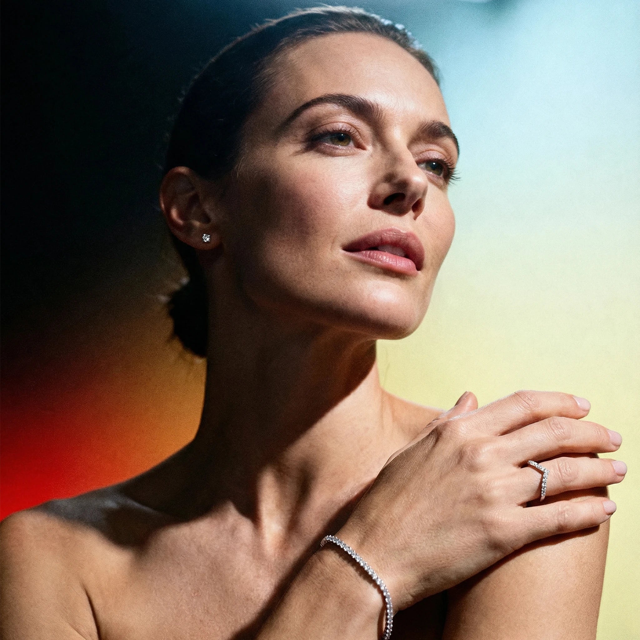 A round brilliant diamond set at the center and surrounded by a refined halo of pavé diamonds. Designed to amplify light while preserving a clean and timeless silhouette. A considered balance of brilliance and restraint for everyday wear.